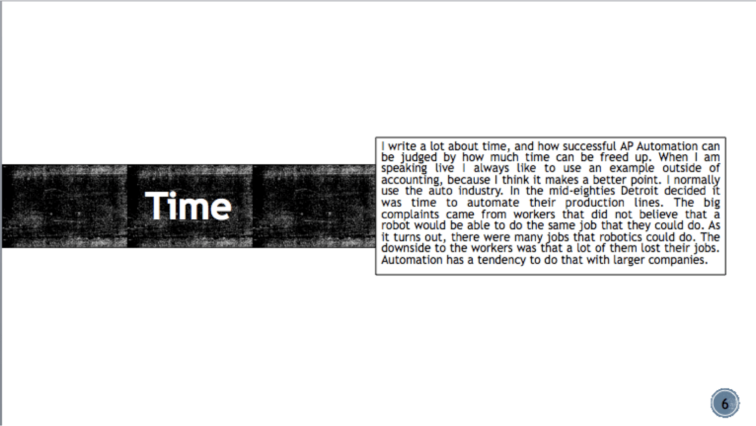Creating two presentations may seem like a lot of work, however, the unintended consequence is that if you create the leave behind first it will help craft your conversation and put you in a great position to have excellent content when you get up in front of the group.